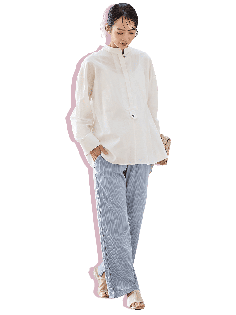 ベーシックアイテムの中でも王道の『ロンT』は、毎日でも着たくなるアイテム。両サイドに授乳口がついているので、赤ちゃんを待たせることなくサッと授乳できて産後も便利です。Coordinate Items