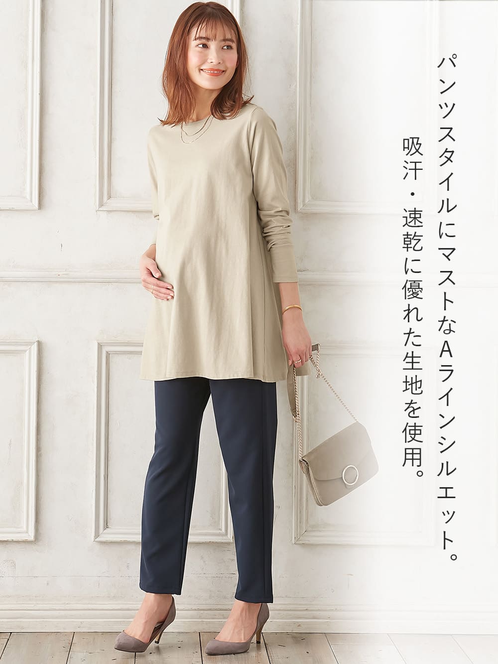 普段使いしやすいレーヨン混で落ち感のある高見え素材で、らくちんなのにきれいめ。 ランダムリブが縦のラインを強調してすっきりとした下半身に見え、締め付け感がないからつわり期や臨月期、忙しい産後まで大活躍してくれます。